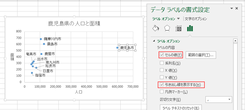 - 「データラベルの書式設定」でラベルオプションを選択して、「セルの値」と「引き出し線を表示する」にチェックを入れます。
