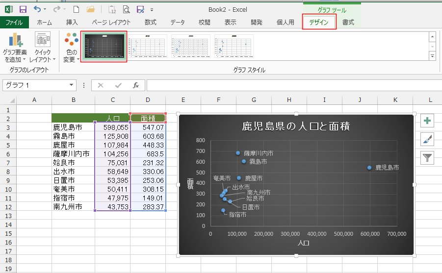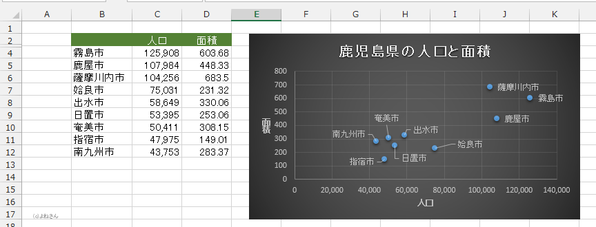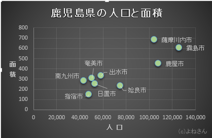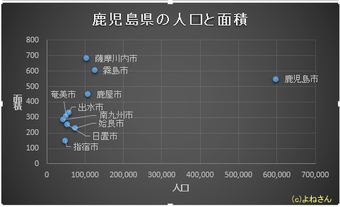 - 作成した散布図を見ると、「鹿児島市」のデータが他に比べて離れています。このデータを非表示にしたいと思います。