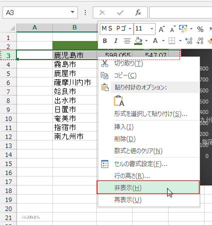 - 「鹿児島市」のデータ行(3行目)を選択して、]右クリックします。