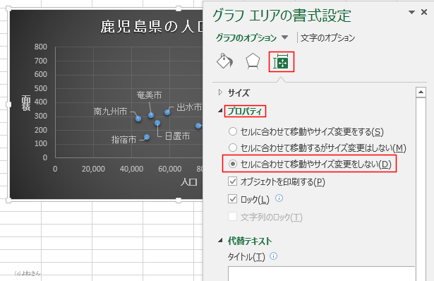 [サイズとプロパティ]を選択して、プロパティで「セルに合わせて移動やサイズ変更をしない」にチェックを入れます。