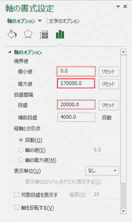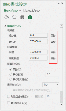 軸のオプションを選択すると、境界値や目盛間隔が自動になっているのが分かります。