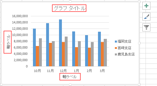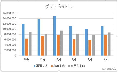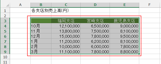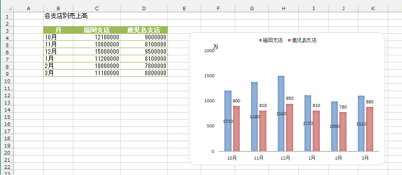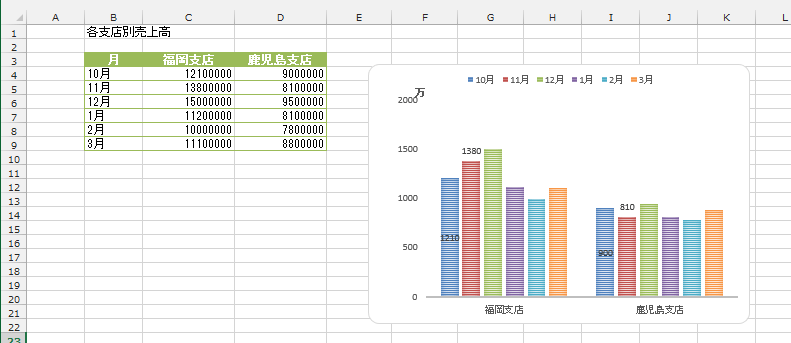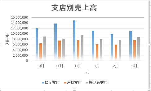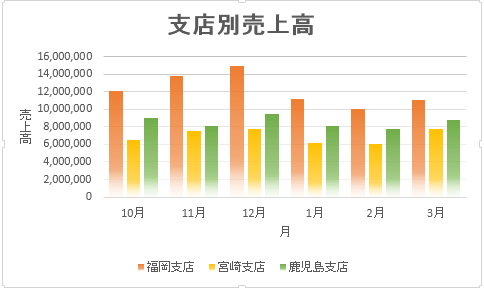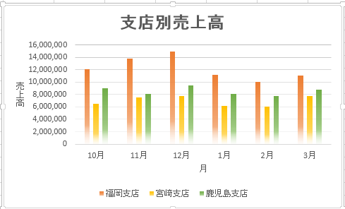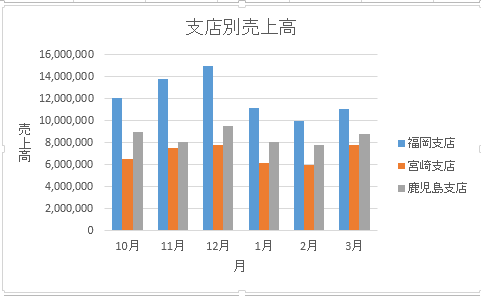 下図の例では「月」の数が支店の数よりも多いので、項目軸に「月」が表示されました。