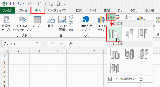 - [挿入]タブの[縦棒グラフの挿入]→[集合縦棒]を実行します。