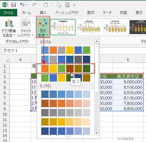 - 項目軸を支店に切り替えるには、グラフツールの[デザイン]タブにある[行/列の切り替え]を実行します。