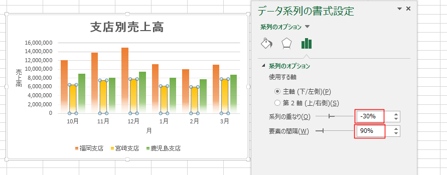 系列の重なりを「-30%」、要素の間隔を「90%」としました。
