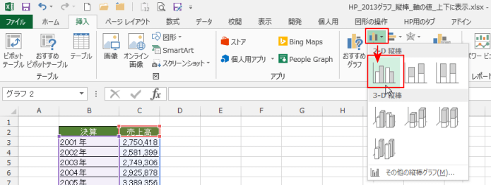 - B2:C14を選択して、[挿入]タブの[縦棒グラフの挿入]→[集合縦棒グラフ]を選択します。