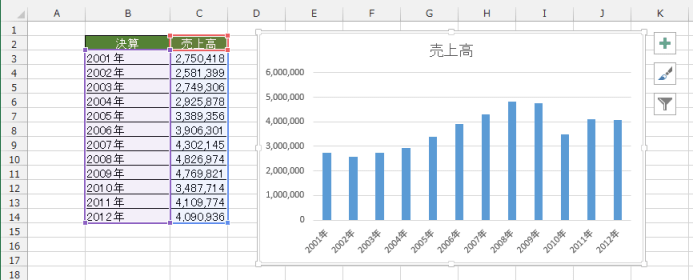 - 下表の売上高データを使って、上下に伸びる縦棒グラフを作成します。