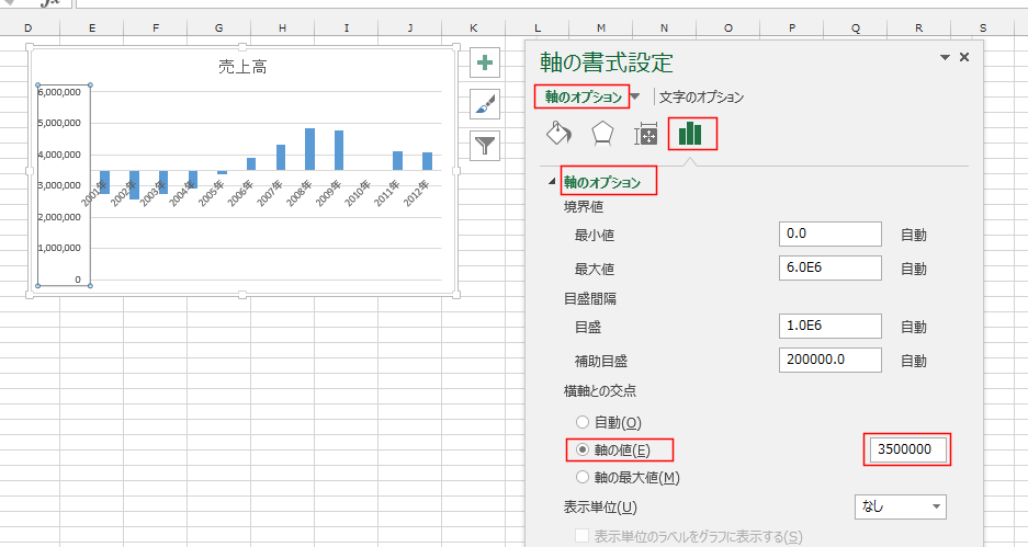 軸の値に「3500000」と入力しました。