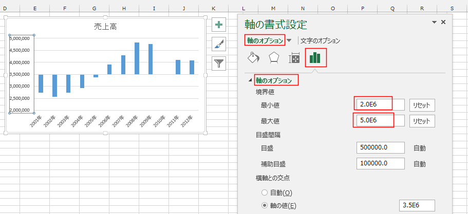 軸のオプションを選択して、最小値を「2.0E6」、最大値を「5.0E6」と設定しました。