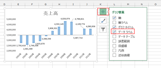 グラフ要素から「データ ラベル」を表示しました。