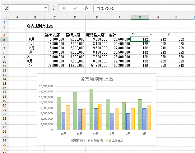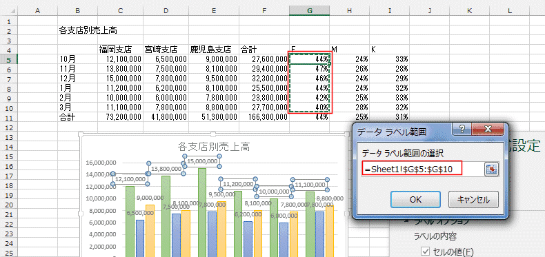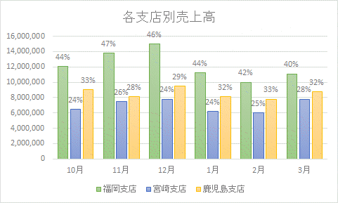 - 縦軸(Y 軸)の目盛は金額になっています。ラベルに使用した比率の部分を使ってグラフを作成したのではないのが分かります。