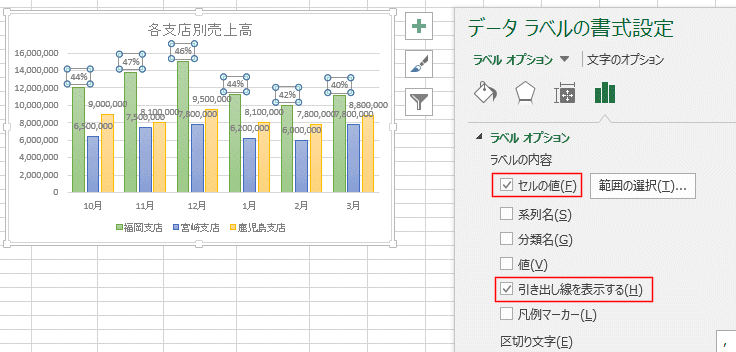 - ラベルオプションで「セルの値」と「引き出し線を表示する」の2つにチェックを入れた状態にしました。