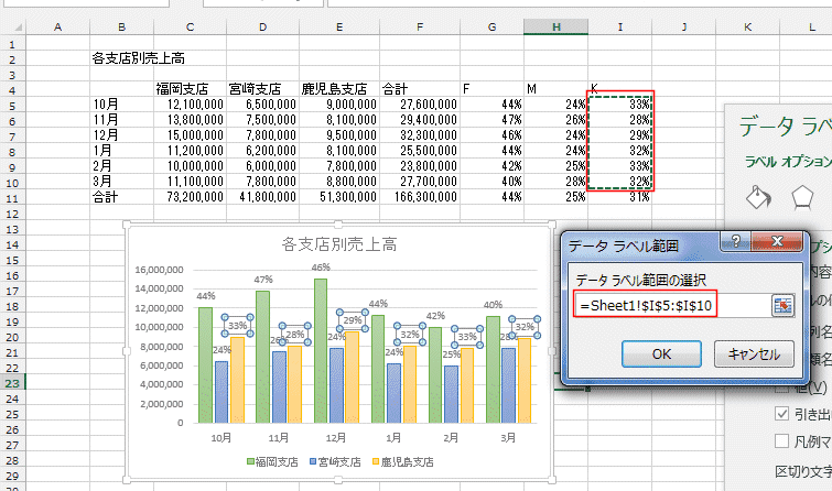 - Excel2013ではデータラベルにセルの値を利用することができるようになりました。