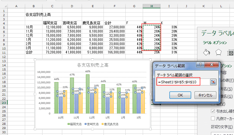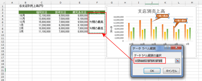 - 系列「宮崎支店」のラベルも同様に、「セルの値」にラベル範囲を指定します。