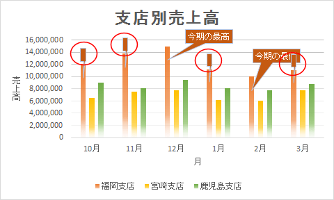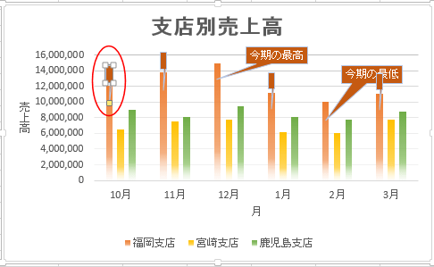 - 「福岡支店」のデータラベルをダブルクリックして、書式設定ウィンドウを表示します。