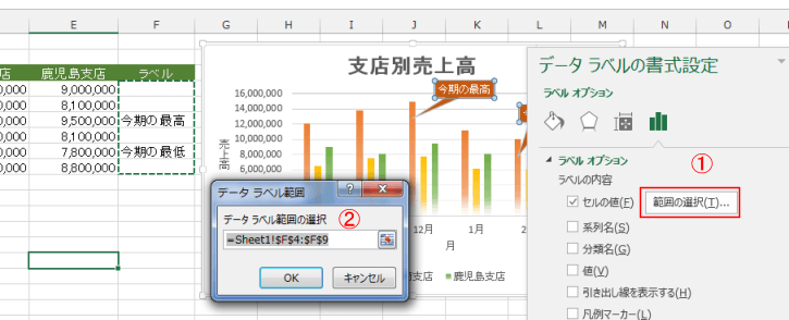 - 系列「鹿児島支店」のラベルも同様に、「セルの値」にラベル範囲を指定します。