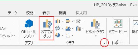 - [挿入]タブの[おすすめグラフ]をクリックします。または、グループにあるダイアログボックス起動ツールをクリックします。