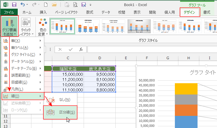 [グラフ要素を追加]→[線]→[区分線]を選択します。