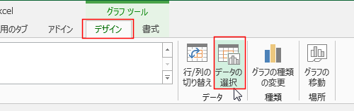 - グラフツールの[デザイン]タブを選択し、[データの選択]を実行します。