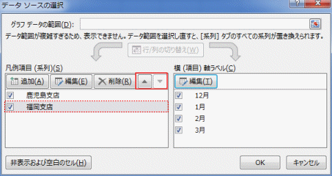 - 凡例項目(系列)で項目を選択して、[▲][▼]ボタンをクリックして順番を入れ替えます。