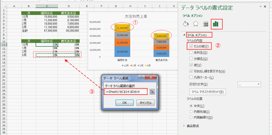 データラベル範囲で比率の計算結果が表示されているセル範囲を指定します。(下図ではC14:D14になっています)