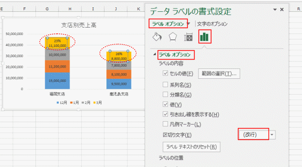- ラベルオプションの区切り文字で「改行」を選択して、データラベルを2行で表示しました。