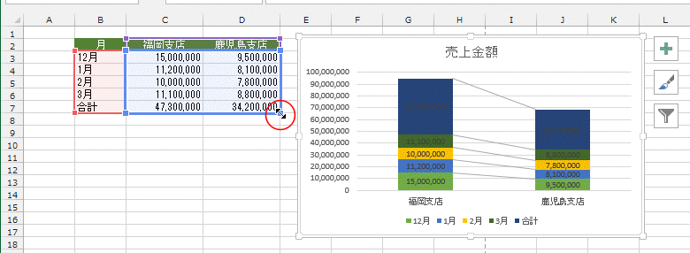 - グラフのプロットエリアを選択して、データ範囲を合計まで広げます。