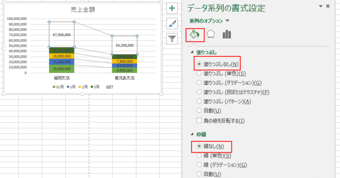 「塗りつぶしと線」を選択し、「塗りつぶしなし」「線なし」にチェックを入れます。