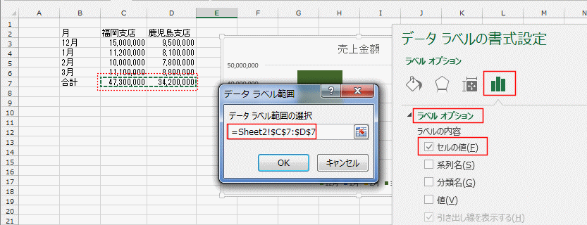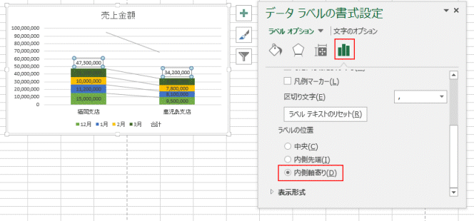 - 合計のラベルを選択して、ラベルの位置を「内側軸より」に設定しました。