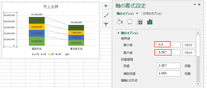 - 縦軸を選択して、最小値を「0」、最大値を「5.5E7」としました。