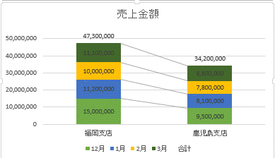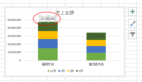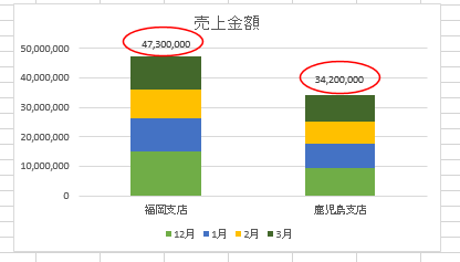 - 合計値を積み上げ縦棒グラフの上に配置できました。