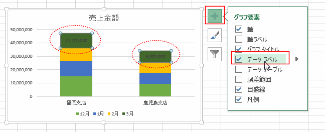 - データラベルの1つを積み上げ棒グラフの上に移動します。