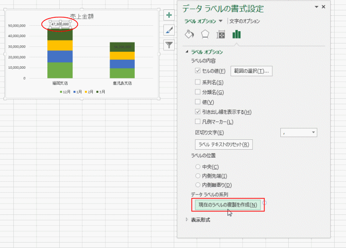 - データラベルの書式設定で、ラベルオプションの[現在のラベルの複製を作成]をクリックします。