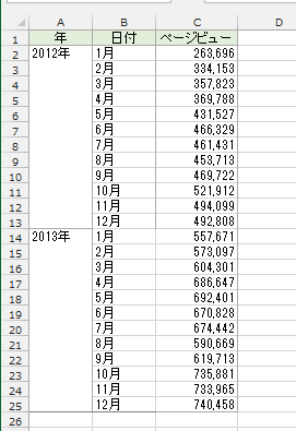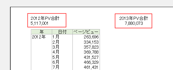 | Sub myHeader() With ActiveSheet.PageSetup .LeftHeader = "2012年PV合計" & Chr(10) & _ Format(Application.WorksheetFunction.Sum(Range("C2:C13")), "#,##0") .CenterHeader = "2013年PV合計" & Chr(10) & _ Format(Application.WorksheetFunction.Sum(Range("C14:C25")), "#,##0") End With ActiveWindow.SelectedSheets.PrintPreview End Sub |