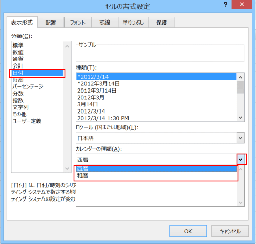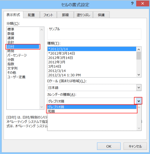分類で[日付]を選択すると、カレンダーの種類が「グレゴリオ暦」と「和暦」に変わっています。