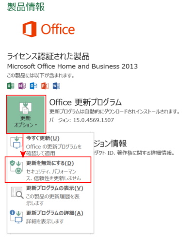 [更新オプション]ボタンをクリックして、[更新を無効にする]を選択します。
