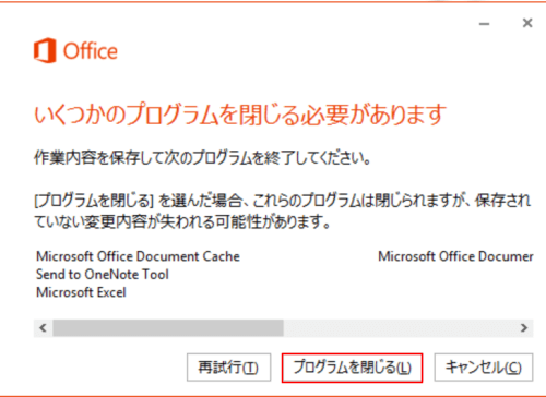 - Officeのプログラムが起動しているときは、下図のメッセージが出ますので[プログラムを閉じる]をクリックして、プログラムを閉じます。