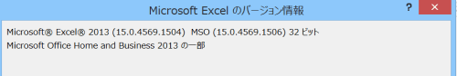 下図のようにMicrosoft Excel2013 (15.0.4569.1504) と表示されました。