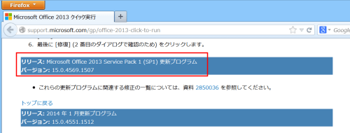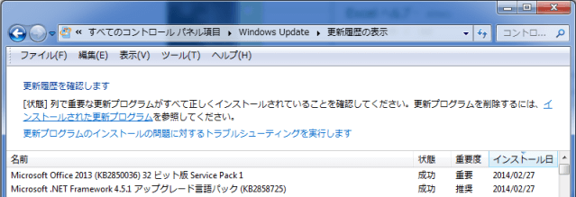 - なお、Windows Updateで更新するMSIタイプのOffice2013の場合は更新履歴の表示でService Pack1 に更新したことを確認できます。