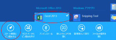 - スタート画面にExcel2013のタイルがない場合は、スタート画面にタイルを表示します。