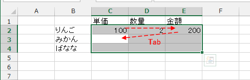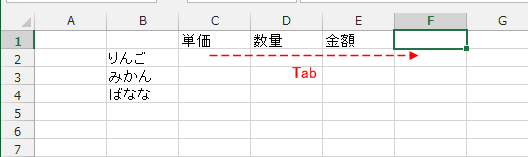 - 右方向(列方向)へ連続して入力するときは、[Tab]キーを使います。