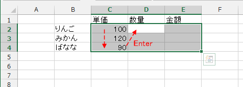 選択範囲の行末で[Enter]キーを押すと、次の列へ移動します。