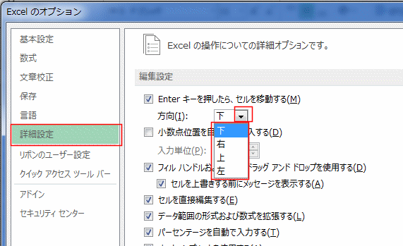 - [詳細設定]を選択して、「Enterキーを押したら、セルを移動する」の方向を「下、右、上、左」から選択します。