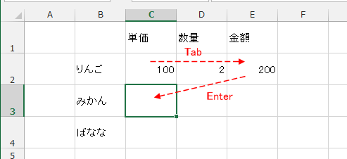入力する方向によってEnter/Tabキーを使い分けます。