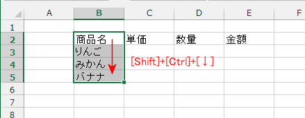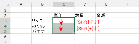- [Shift]+[↓]、[Shift]+[↓]で選択した状態(1行ずつ選択しています)