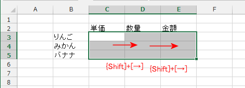 - [Shift]+[→]、[Shift]+[→]で選択した状態(1列ずつ選択しています)