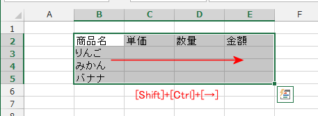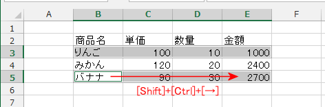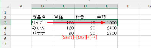 - [Shift]+[Ctrl]+[→]で範囲を選択した状態