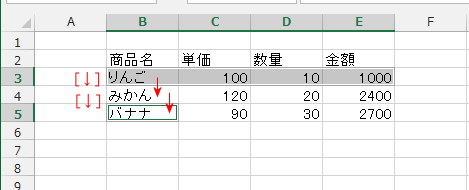- カーソルキー[↓]でアクティブセルを移動