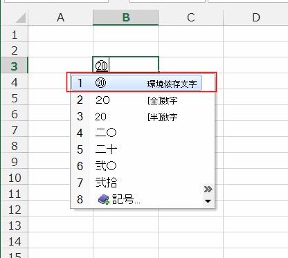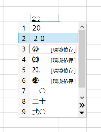 変換候補に丸付きの20が表示されました。
