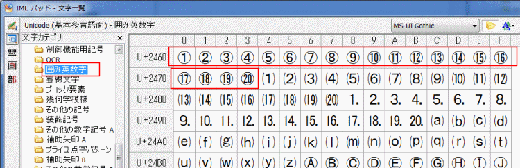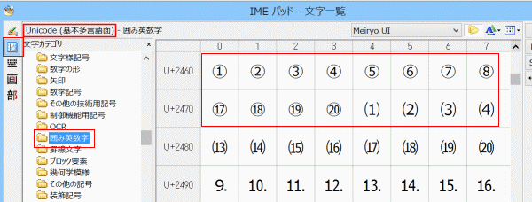 「Unicode(基本多言語面)」→「囲み英数字」を選択します。